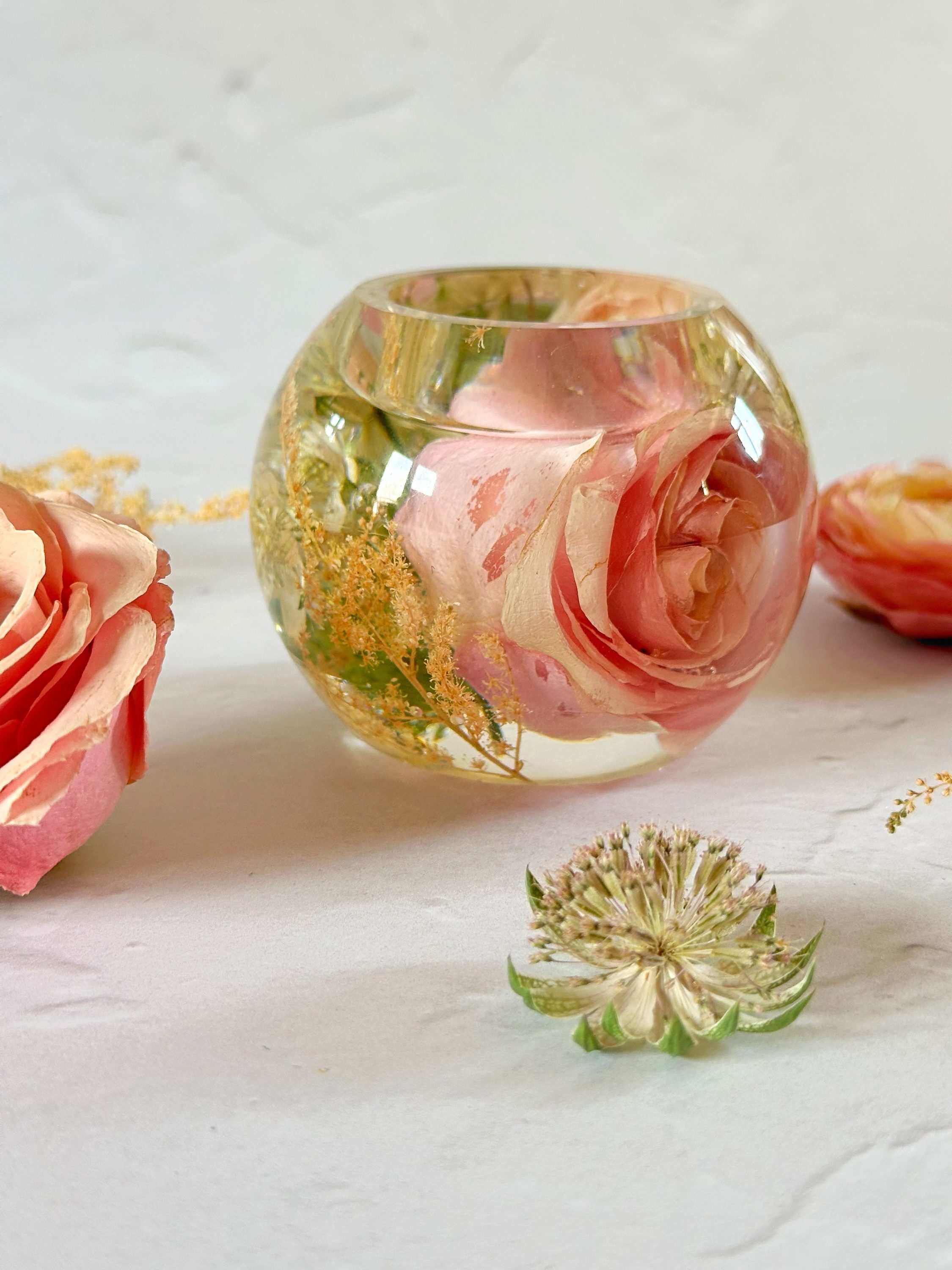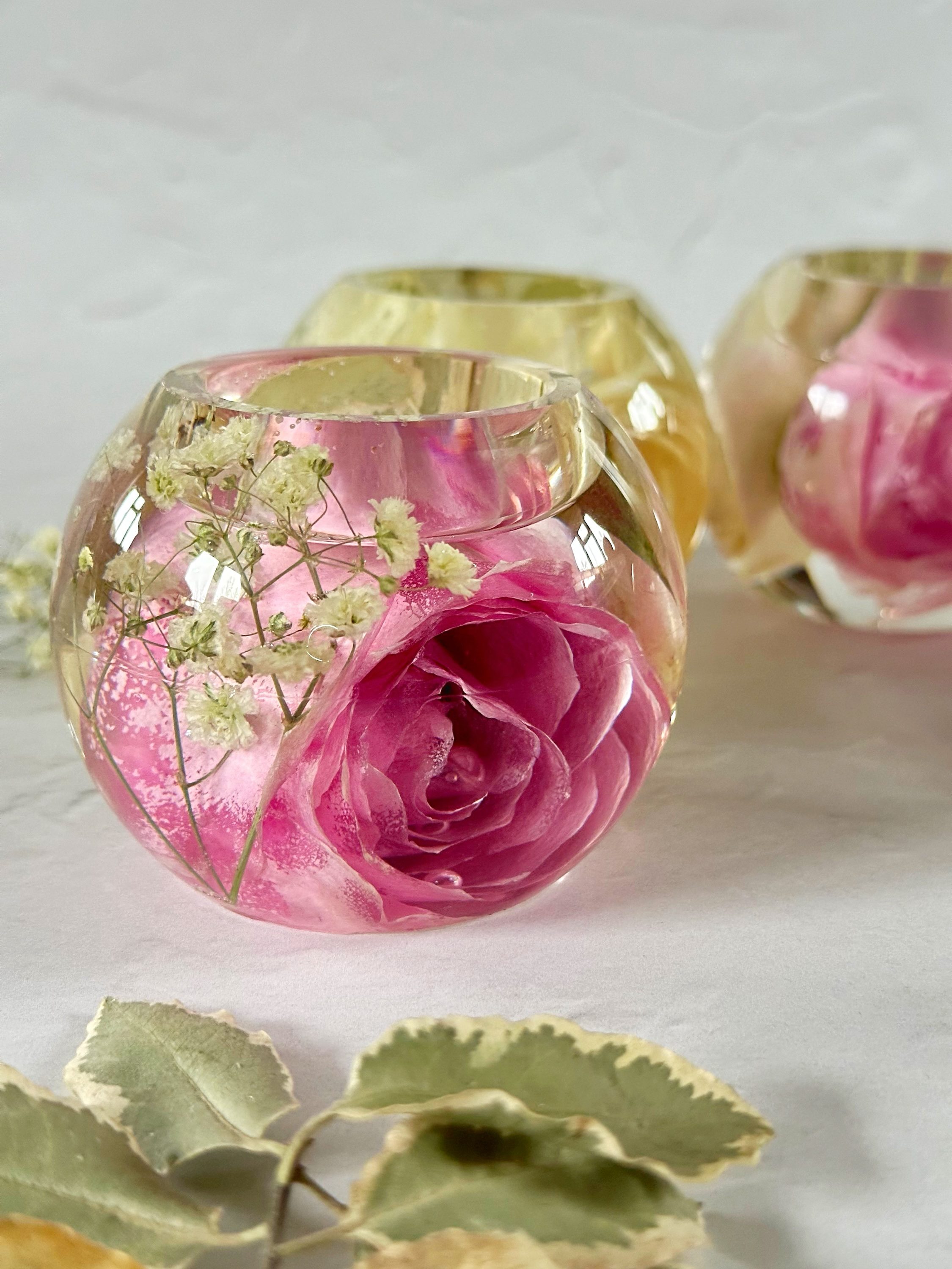 Sphere Tealight Holder£75.00 Our Sphere Tealight holders are the perfect mix of ornamental and practical They fit in a mixture of small/medium flowers ** Whilst they are practical, please take care with naked flames near the resin as it can discolour/burn the resin ** Categories: Flower Preservation, Resin Options Related products Flower Preservation/Resin OptionsBottle Stopper – Add on item £45.00 Flower Preservation/Resin OptionsSkull Ornament £120.00 Flower Preservation/Jewellery OptionsDiamante Heart Pendant £120.00